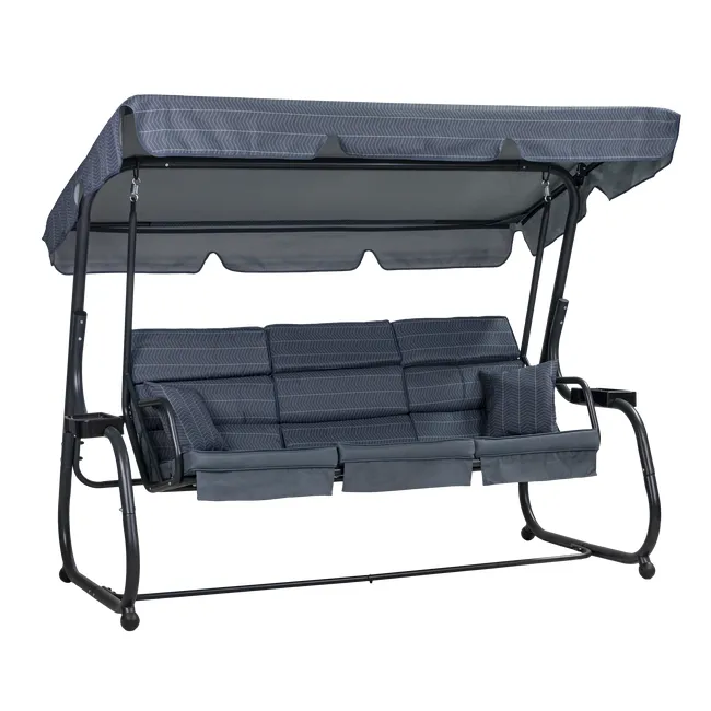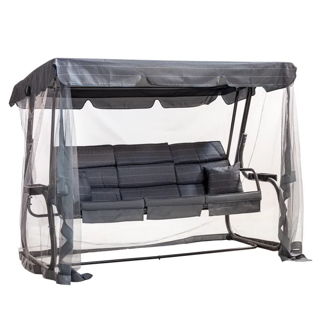 Nowoczesna huśtawka ogrodowa w kolorze grafitowym dla 3 osób, która doskonale sprawdzi się w ogrodzie i na tarasie, jako ulubione miejsce wypoczynku. Duża powierzchnia umożliwia relaks w dowolnej pozycji. Siedzisko huśtawki wyposażone zostało w miękkie poduchy z poliestru i dodatkowe mniejsze poduszki dekoracyjne. To materiał o zwiększonej odporności na warunki atmosferyczne oraz łatwy w czyszczeniu. Przydatną funkcją jest możliwość rozłożenia siedziska do pozycji leżącej, co sprawdzi się na przykład podczas drzemki. Dużym atutem huśtawki jest daszek i moskitiera. Daszek z poliestru posiada funkcję regulacji kąta nachylenia, dzięki czemu skutecznie chroni przed promieniami słonecznymi padającymi z różnej strony. Z kolei moskitiera