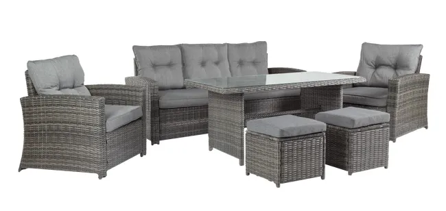 Meble ogrodowe zestaw Kara stalowe szare to komplet przeznaczony dla siedmiu osób. W jego skład wchodzą następujące elementy: trzyosobowa sofa, dwa fotele i ottomany oraz stół. Dzięki temu wygodne miejsce znajdzie dla siebie nawet siedem osób. Proponowane przez nas meble wyróżnia między innymi atrakcyjny wygląd. Wykonane zostały one w modnym, antracytowym kolorze, dzięki czemu doskonale wpisują się w obowiązujące trendy. Oprócz znakomitego designu omawiany zestaw cechuje się także niezwykłą trwałością. Wynika ona głównie z materiałów wykorzystanych do produkcji poszczególnych elementów, których konstrukcje wykonane zostały z wysokiej jakości stali. Siedziska oraz oparcia foteli, ottomanów i sofy są z kolei z poliestru,