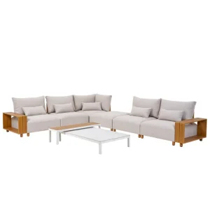 Zestaw wypoczynkowy z narożnikiem marki Corciano w modelu Mostar to elegancka i funkcjonalna propozycja do przestrzeni ogrodowej, idealna do relaksu i spotkań w gronie rodziny oraz przyjaciół. Zestaw składa się z trzech elementów sofy: lewa sofa (166x78x80 cm), prawa sofa (166x78x80 cm) oraz sofa narożna (80x78x80 cm), co łącznie zapewnia wygodne miejsce dla siedmiu osób. W komplecie znajduje się również prostokątny stół o wymiarach 110x64x68 cm, wykonany z aluminium, które jest odporne na korozję i łatwe w utrzymaniu. Siedziska sofy są wykonane z trwałego aluminium, co zapewnia ich długowieczność i odporność na zmienne warunki atmosferyczne. Całość utrzymana jest w eleganckim,