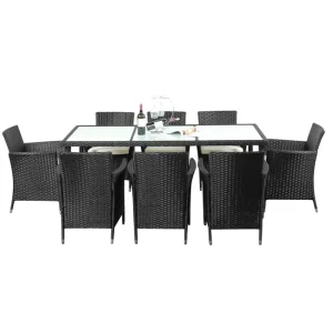 Zestaw mebli ogrodowych jadalnianych marki Esti&Esta łączy w sobie elegancję i funkcjonalność, oferując doskonałe rozwiązanie do każdej przestrzeni na świeżym powietrzu. Stół o wymiarach 120x74x120 cm, wykonany z solidnego aluminium z okrągłym blatem ze szkła, stanowi centralny punkt zestawu. Jego elegancki design i trwałe materiały sprawiają, że jest idealny na letnie spotkania i rodzinne obiady w ogrodzie. Do stołu dołączone są wygodne krzesła o wymiarach 65x84x64 cm, które zapewniają komfort podczas długich posiłków. Krzesła są wykonane z syntetycznego rattanu, co zapewnia odporność na warunki atmosferyczne oraz łatwość w utrzymaniu czystości. W zestawie znajdują się również cztery poduszki, które dodatkowo zwiększają