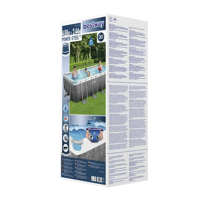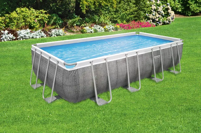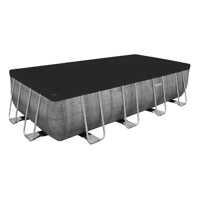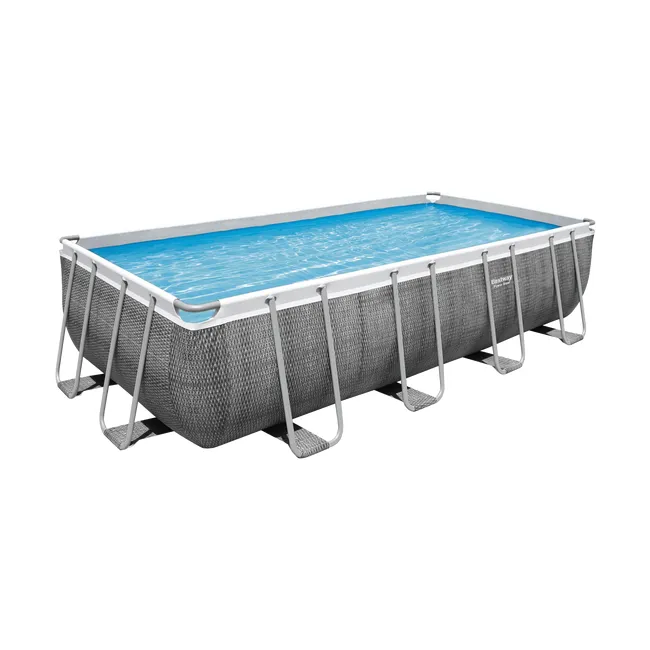 Łatwy montaż. Metalowe ramy odporne na korozję. Wbudowany zawór spustowy z regulacją przepływu ułatwia opróżnianie poprzez podłączenie węża ogrodowego (adapter w zestawie) w celu spuszczenia wody. Realistyczny nadruk imitujący rattan nadaje ogrodowi ciepły i elegancki wygląd. Prostokątny kształt zapewnia więcej miejsca do pływania i zabawy. Basen wyposażony w system Seal & Lock™, chroniący przed korozją. Dozownik ChemConnect™ utrzymuje wodę w basenie czystą i zdrową. Uwalnianie chemii przez dozownik zapewnia stabilny poziom chloru, niezbędny do właściwego zbalansowania chemii. Pojemność wody (90%): 11 532 l. Podwodne łatki naprawcze. Wyjątkowo wytrzymałe ściany boczne wykonane z Tritech™, 3-warstwowego wzmocnionego materiału z rdzeniem z siatki poliestrowej umieszczonym między dwoma warstwami grubego PVC. Całkowita grubość wynosi 0,40-0,80 mm w zależności od rozmiaru basenu, zapewniając doskonałą trwałość i wytrzymałość.
