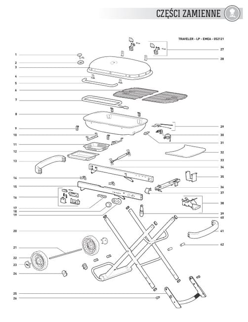 | Dodatkowe akcesoria | Pokrywa ochronna | Półka | Wózek | Zbiornik na tłuszcz | Zintegrowany termometr |