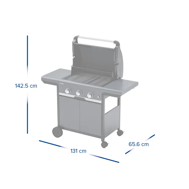 Wydajne palniki: Trzy stalowe palniki o łącznej mocy 9 kW szybko nagrzewają ruszt, umożliwiając grillowanie, gotowanie na płycie i podgrzewanie dań.