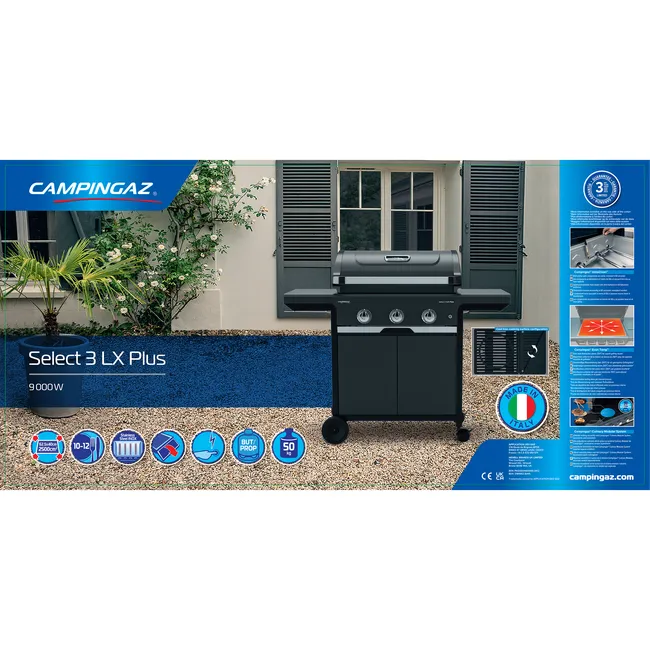 Grill gazowy SELECT 3 LX PLUS marki Campingaz to nowoczesne i wszechstronne urządzenie, które pozwala cieszyć się smakiem idealnie przyrządzonych potraw na świeżym powietrzu. Dzięki solidnej stalowej obudowie i żeliwnym rusztom, grill gwarantuje trwałość i równomierne rozprowadzanie ciepła, zapewniając doskonałe efekty kulinarne.