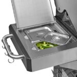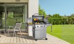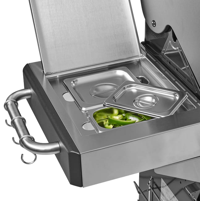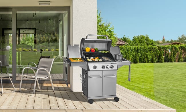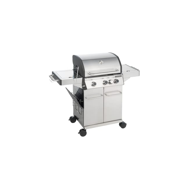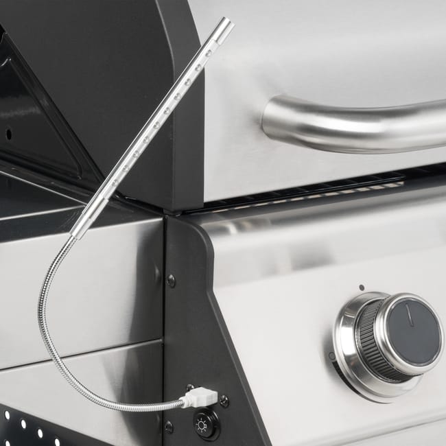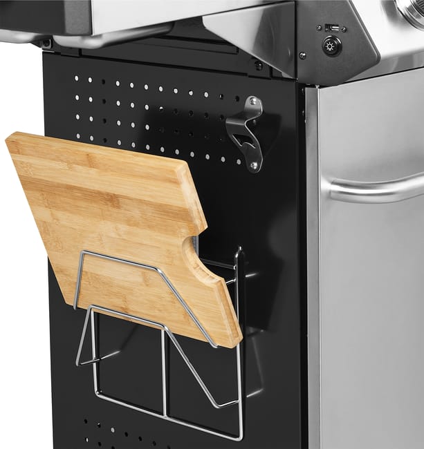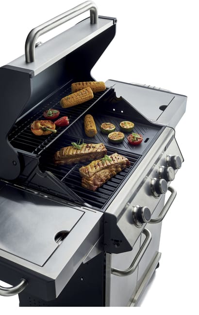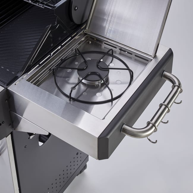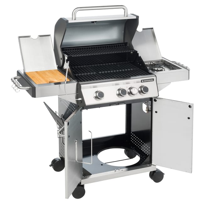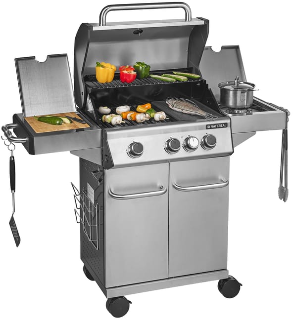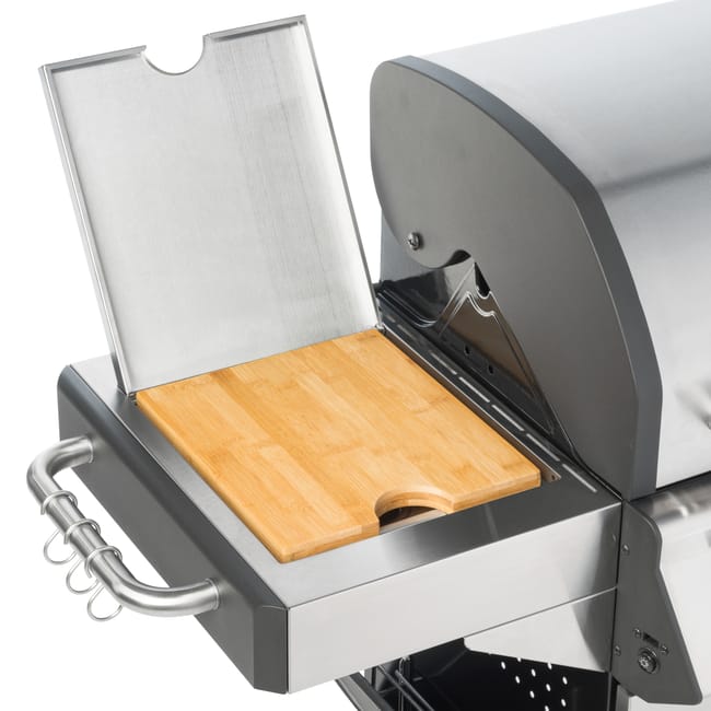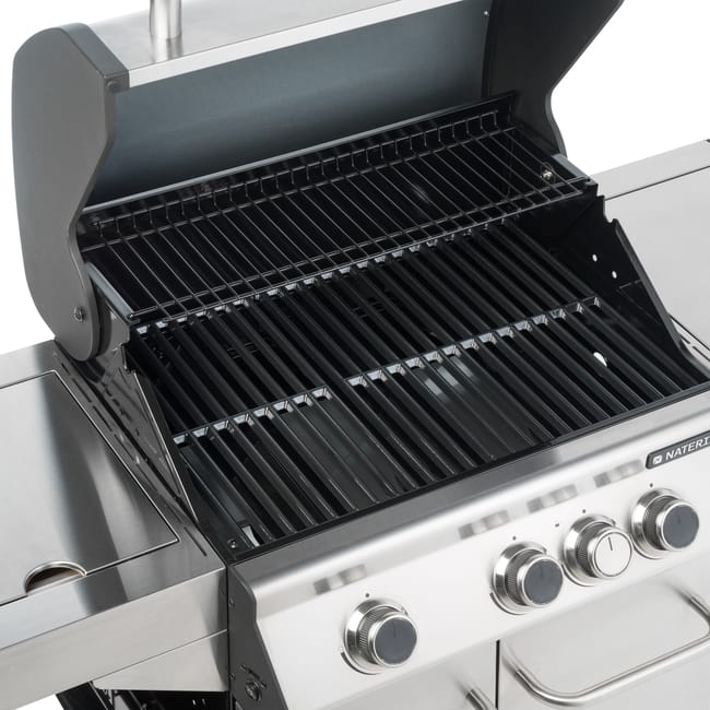 Grill gazowy Hudson Naterial z 3 palnikami głównymi o mocy 10,5 kW i 1 planikiem bocznym o mocy 3 kW posiada różne rodzaje rusztów i płyt, które dają możliwość grillowania dużych i małych kawałków mięsa, burgerów oraz pokrojonych warzyw bez obawy, że wpadną w szczeliny. Dodatkowy palnik boczny umożliwia gotowanie dodatków w trakcie grillowania. Włącznik zapłonu w pokrętle ułatwia rozpalanie grilla jedną ręką, podczas gdy w drugiej trzymamy np. półprodukty przyniesione z kuchni. Zaletą grilla jest jego bogate wyposażenie: otwieracz do butelek, haki na akcesoria i uchwyt na ręcznik papierowy, pojemniki gastronomiczne oraz deska bambusowa – wszystko to sprawia, że grill gazowy to prawdziwa kuchnia na świeżym powietrzu. Kolejnymi zaletami grilla są obrotowe kółka, które ułatwiają transport grilla w wybrane miejsce oraz półka mieszcząca nieestetyczną butlę gazową. Ruszty z emaliowanego żeliwa oraz wysuwany ociekacz na tłuszcz znacznie ułatwiają czyszczenie. Grill gazowy Kenton Hudson idealnie nadaje się do przygotowania posiłków na świeżym powietrzu dla co najmniej 8 osób. Posiada 5-letnią gwarancję.