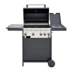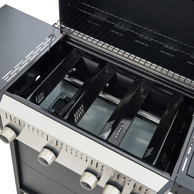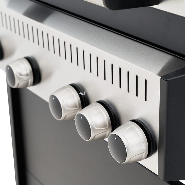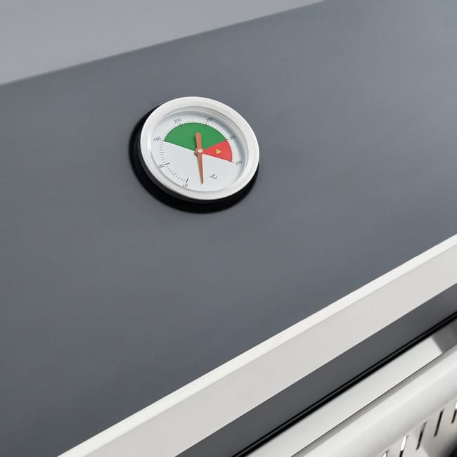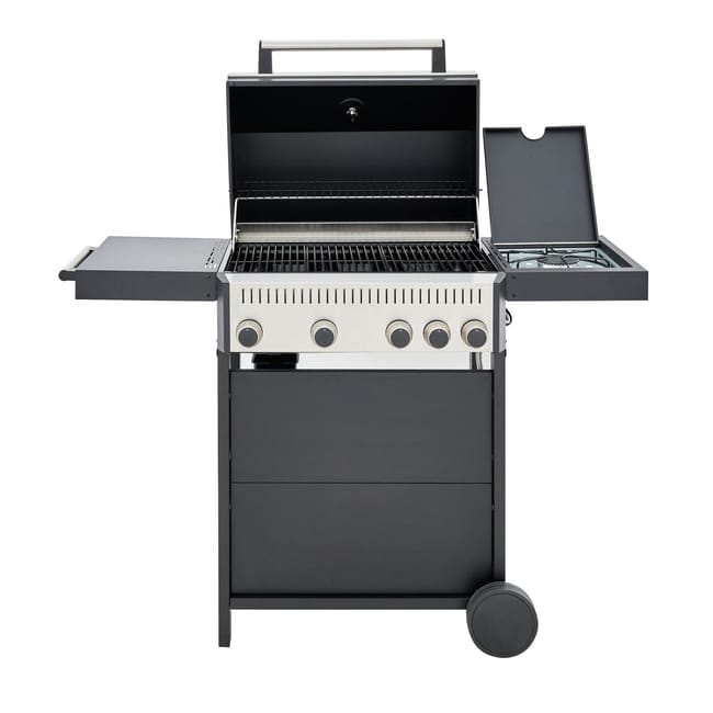 Grill gazowy z 5 palnikami, wbudowanym termometrem i praktycznym schowkiem – wykonany ze stali malowanej proszkowo na czarno.