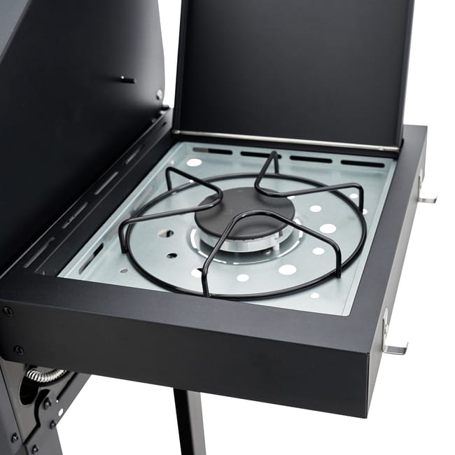 wykonanie z lakierowanej blachy stalowej korpus urządzenia w kolorze czarnym pokryty lakierem proszkowym żeliwny ruszt grillowy chromowany ruszt do podgrzewania