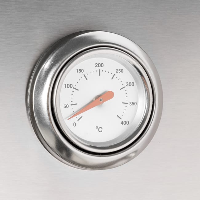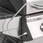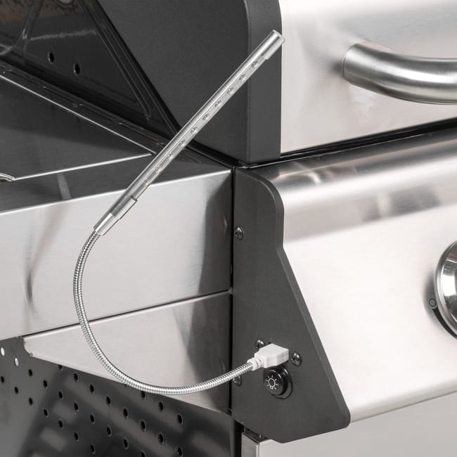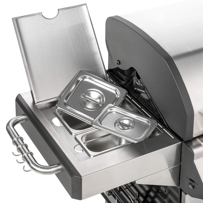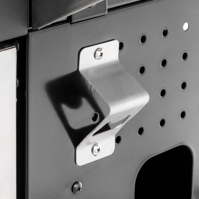 Praktyczne wyposażenie: Grill posiada wbudowany termometr, otwieracz do butelek, haki na akcesoria, uchwyt na ręcznik papierowy, pojemniki gastronomiczne oraz bambusową deskę do krojenia.