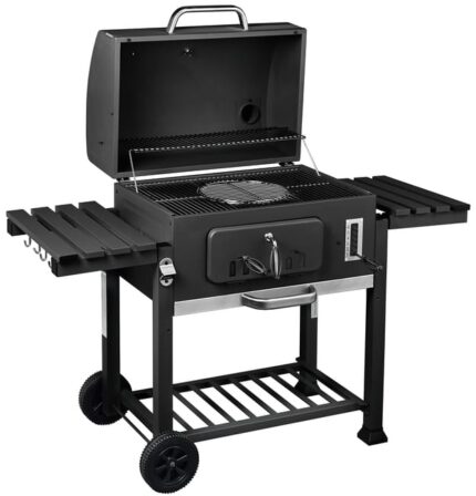 Mobilny wózek: Cztery wytrzymałe koła z dwoma hamulcami umożliwiają łatwe przemieszczanie grilla bez utraty stabilności, idealnie nadaje się do różnych miejsc w ogrodzie lub na tarasie.