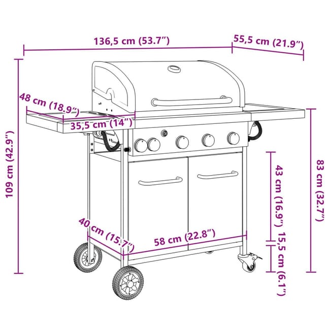 136,5 x 55,5 x 109 cm – duża powierzchnia grillowania przy jednoczesnej oszczędności miejsca.