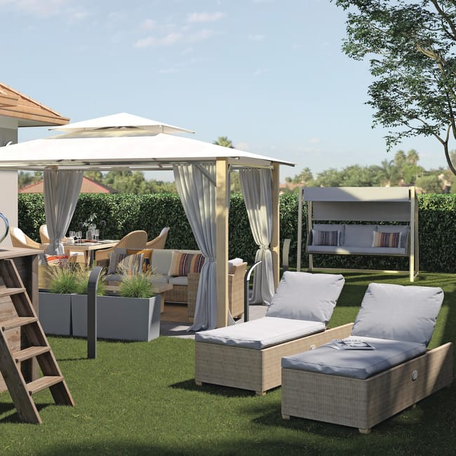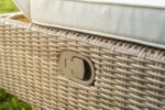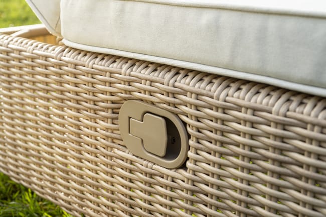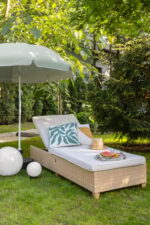 Leżak Madera Naterial w odcieniu beżowym to doskonały wybór dla osób ceniących komfort podczas relaksu na świeżym powietrzu. Regulowane oparcie pozwala dostosować pozycję do własnych potrzeb – niezależnie od tego, czy chcesz poczytać książkę, czy zdrzemnąć się w słońcu. Leżak wykonano z żywicy polietylenowej (syntetycznego rattanu), przyjemnej w dotyku i o półokrągłym splocie, który wiernie imituje naturalny ratan. Miękkie, wygodne poduszki uszyto z tkaniny poliestrowej o właściwościach hydrofobowych, odpornej na promieniowanie UV i niekorzystne warunki atmosferyczne. Poszewki można łatwo zdjąć w celu odświeżenia. Konstrukcja aluminiowa zapewnia odporność na trudne warunki pogodowe, a jednocześnie sprawia, że mebel jest lekki i łatwy do przenoszenia. Całość uzupełnia efekt drewna zastosowany na plastikowych nóżkach. Oplot polietylenowy zawiera 10% materiałów z recyklingu. Elementy serii Medena wykonano ze stali ocynkowanej, co zwiększa ich trwałość wobec czynników zewnętrznych. Aby zachować wysoką jakość i estetykę, zaleca się przechowywanie mebli zimą w miejscu suchym i zadaszonym, np. w altanie ogrodowej, bądź pod odpowiednim, wodoodpornym pokrowcem. Poduszki również należy chronić przed wilgocią – zwłaszcza nocą i w czasie deszczu.