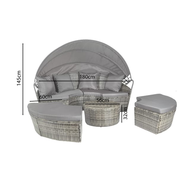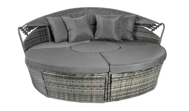 Meble ogrodowe zestaw Bari stalowe szare to wielofunkcyjny zestaw meblowy, który składa się z rozkładanego łóżka oraz pufy. Dzięki różnym możliwościom ustawienia, na zestawie może usiąść jednocześnie nawet 8 osób! Konstrukcja zestawu jest stalowa i pokryta polirattanem, który wygląda bardzo stylowo i jest trwały. Dzięki siedziskom z poduszek, siedzi się na nim niezwykle wygodnie. Rozkładany daszek może chronić przed promieniami słonecznymi lub delikatnym deszczem. Mając taki zestaw w ogrodzie można poczuć się jak na wakacjach!