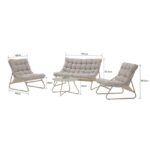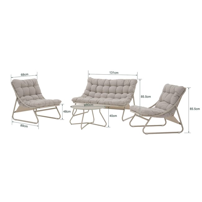 Unikalny zestaw mebli ogrodowych w nowoczesnym stylu, który idealnie sprawdzi się do aranżacji modnych stref wypoczynku na tarasie lub w ogrodzie. W komplecie znajduje się dwuosobowa sofa, dwa fotele i kompaktowy stolik kawowy. Optymalnie wyprofilowane siedziska z systemem oxford i z poduszkami umożliwiają komfortowy wypoczynek w ulubionej pozycji. Rama mebli wykonana została ze stali, co przekłada się na ich trwałość i dłuższy czas użytkowania. Miękkie poduchy ze spun poliestru świetnie sprawdzą się w użytkowaniu zewnętrznym dzięki wyższej odporności na wilgoć. Zestaw mebli ogrodowych wyposażony jest w stolik kawowy z blatem ze szkła hartowanego, które wyróżnia się wyższą odpornością na zarysowania i jest łatwe w utrzymaniu w czystości. Całość to wygodny i funkcjonalny komplet, który doskonale sprawdzi się podczas wspólnych spotkań