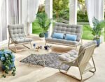 – Rama mebli wykonana ze stali wyróżnia się większą trwałością, dlatego meble posłużą dłużej. – Poduszki ze spun poliestru są bardziej odporne na wilgoć i zagniecenia, dlatego doskonale sprawdzą się podczas wypoczynku na zewnątrz. – Stolik kawowy posiada blat ze szkła hartowanego, które jest bardziej trwałe i łatwe w czyszczeniu.