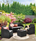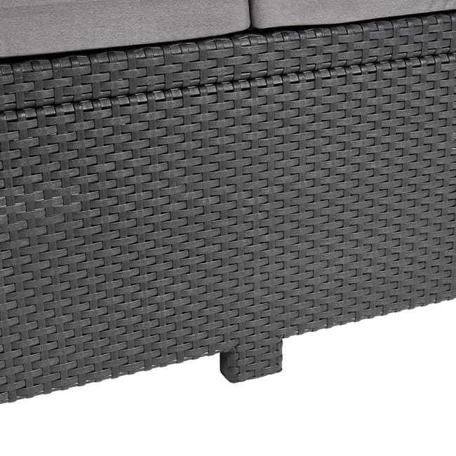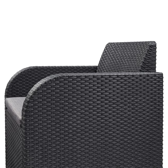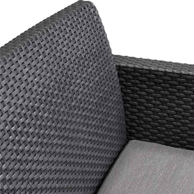 Meble do ogrodu NOVARA Keter pozwolą Ci zrelaksować się na świeżym powietrzu w komfortowych warunkach. Komplet wypoczynkowy składa się z dwuosobowej sofy ogrodowej, dwóch foteli oraz stolika kawowego. Idealny zestaw wypoczynkowy na taras oprócz profilowanych podłokietników i oparć, posiada także miękkie poduszki siedziskowe, które są odporne na mały deszcz lub rozlany napój. Poszczególne elementy zestawu możesz łączyć lub ustawiać osobno w taki sposób, aby odpowiadały Twoim potrzebom.