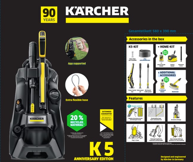 Specjalna edycja urządzenia K 5 Power Control Flex Home & Brush z okazji 90-lecia firmy to limitowany wariant kolorystyczny ze specjalnymi akcesoriami. Urządzenie może być używane do czyszczenia każdej powierzchni z odpowiednim ciśnieniem. Konsultant zintegrowany z aplikacją Kärcher Home & Garden pomaga użytkownikowi znaleźć właściwe ciśnienie, dostarczając praktycznych wskazówek dotyczących każdej sytuacji i zadania – aby uzyskać doskonałe efekty czyszczenia. Urządzenie wysokociśnieniowe imponuje również systemem podawania detergentów Kärcher Plug 'n’ Clean do łatwej wymiany detergentów, wężem wysokociśnieniowym PremiumFlex dla dodatkowej wygody, wysokiej jakości aluminiowym uchwytem teleskopowym ułatwiającym transport, systemem Quick Connect oszczędzającym czas i wysiłek przy wkładaniu i wyjmowaniu węża wysokociśnieniowego z urządzenia i pistoletu spustowego, a także pozycją parkowania zapewniającą łatwy dostęp do akcesoriów w każdej chwili. Zestaw domowy ze szczotką zawiera przystawkę do czyszczenia powierzchni T 5, 1 litr środka do czyszczenia kamienia i elewacji, 1 litr uniwersalnego środka czyszczącego i szczotkę do mycia WB 60.
