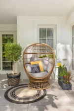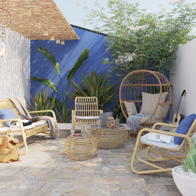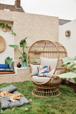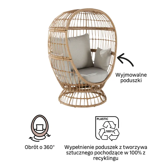 Fotel obrotowy Juno Naterial pozwala na relaks w komfortowych warunkach. Idealny do chwil samotności z książką lub towarzystwem kota, jego wygodne siedzisko otoczone syntetycznym rattanem zapewnia komfort przez długie godziny. Solidna stalowa konstrukcja gwarantuje trwałość, a połączenie stali w kolorze drewna z syntetycznym rattanem nadaje fotelowi naturalny, boho charakter. Grube poduszki siedziska i oparcia zapewniają wygodę, a możliwość obracania fotela wokół własnej osi pozwala podążać za słońcem. Pokrowiec poduszek jest zmywalny i wodoodporny, a wypełnienie oparcia wykonane w 100% z materiału z recyklingu. Fotel łatwo przechowywać zimą lub podczas transportu. Doskonale pasuje do zestawów wypoczynkowych Bellis.