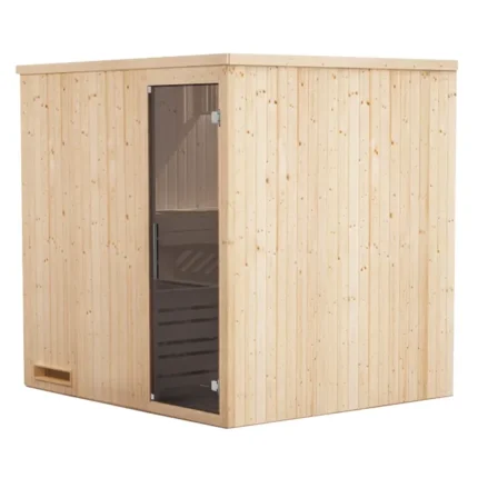 Dzięki prostokątnemu kształtowi sauna łatwo wpasowuje się w każde wnętrze, tworząc komfortową strefę relaksu. Do jej budowy wykorzystano materiały najwyższej jakości, starannie dobrane, aby zapewnić odporność na wysoką temperaturę i wilgoć. Ściany oraz dach wykonano z trwałego drewna świerkowego. Widoczne sęki, subtelne przebarwienia i drobne rysy są naturalną cechą tego surowca i nadają saunie autentyczny wygląd. Wnętrze paneli wypełniono folią aluminiową oraz wełną mineralną, co stanowi dodatkową ochronę przed wilgocią. Drzwi o szerokości 550 mm wykonane są z wytrzymałego, hartowanego szkła grafitowego o grubości 8 mm. Wyposażenie sauny obejmuje dwie ławki i zagłówki z drewna lipowego, lampę oraz obudowę pieca. Piec należy zakupić oddzielnie.