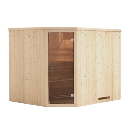 Domowa sauna fińska została zaprojektowana dla trzech osób. Dzięki prostokątnemu kształtowi łatwo wpasowuje się w wnętrze, tworząc komfortową strefę relaksu.
