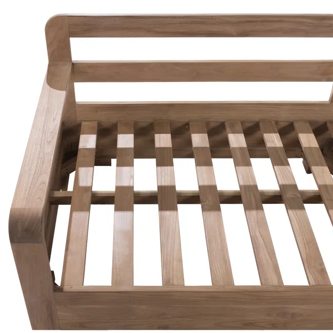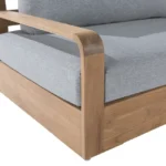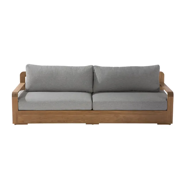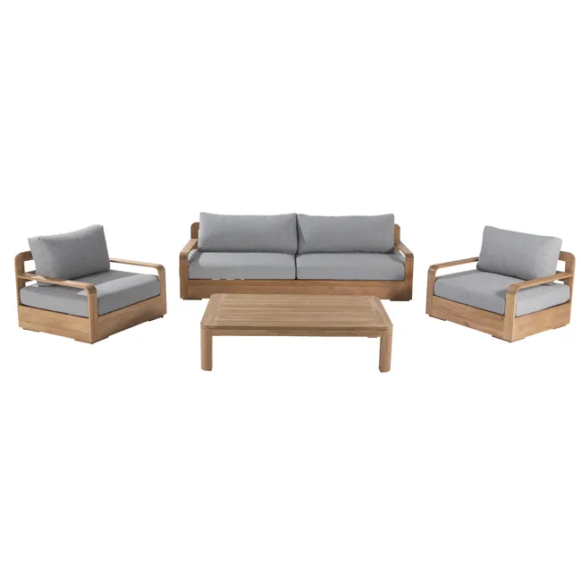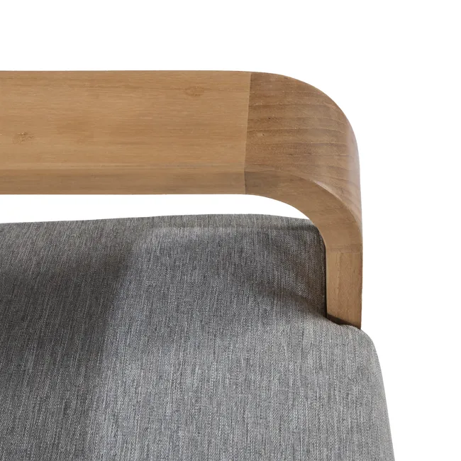 Ciepła, niska i otulająca sofa, stworzona z myślą o chwilach relaksu po posiłku czy porannej kawie. Konstrukcja z teaku pochodzącego z recyklingu FSC w połączeniu z miękkimi szarymi poduszkami tworzy naturalny i elegancki kącik wypoczynkowy. Sofa jest odporna na wilgoć, wygodna w pielęgnacji i doskonale komponuje się z pozostałymi elementami kolekcji Baelo, tworząc harmonijną przestrzeń w ogrodzie lub na tarasie.