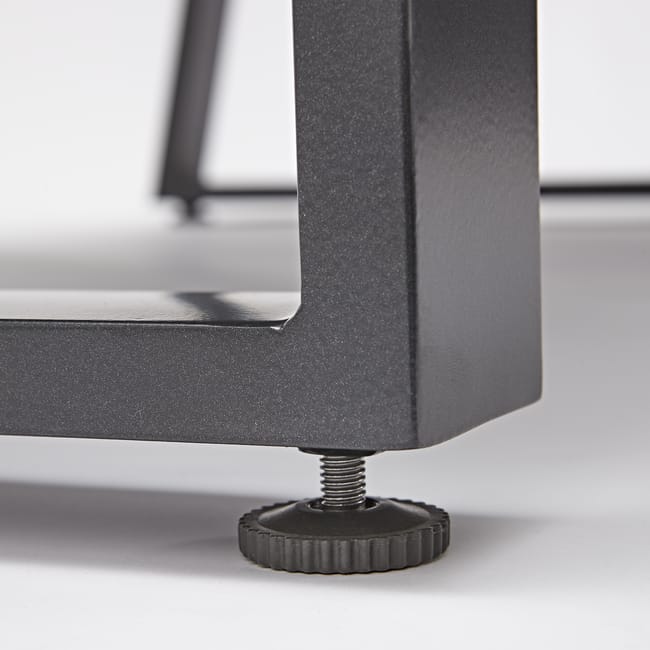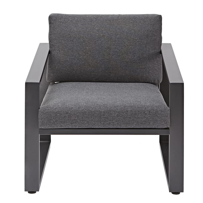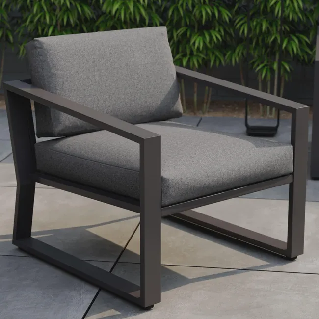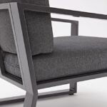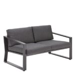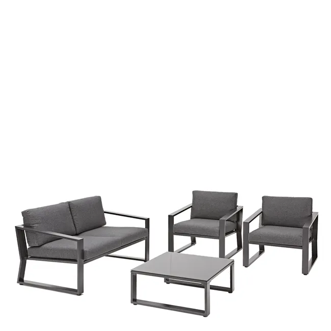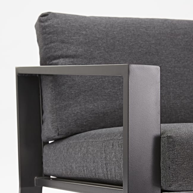 Zestaw składa się z dwuosobowej sofy, dwóch foteli oraz stolika kawowego z kwadratowym, szklanym blatem. Stabilna aluminiowa konstrukcja oparta na nogach w kształcie litery „U” nadaje meblom nowoczesny, geometryczny charakter, a jednocześnie zapewnia solidność i wygodę użytkowania.