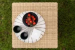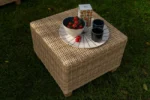Blat stołu z przezroczystego, bezpiecznego szkła eksponuje rattanowe wykończenie, a nogi w kształcie litery „U” nadają mu nowoczesny charakter. Konstrukcję mebli wykonano z aluminium, co zapewnia trwałość w wymagających warunkach atmosferycznych, a jednocześnie lekkość, ułatwiającą przenoszenie. Okucia zestawu wykonane ze stali ocynkowanej zwiększają odporność na czynniki zewnętrzne.