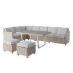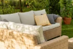 Zestaw mebli ogrodowych Medena Naterial pomieści do 7 osób. Doskonale sprawdzi się zarówno jako komplet jadalniany, jak i miejsce do relaksu, dzięki dużej, wygodnej sofie narożnej. Meble wykonano z żywicy polietylenowej (syntetycznego rattanu) o półokrągłym splocie, przyjemnym w dotyku i realistycznie przypominającym naturalny rattan. Oplot polietylenowy zawiera 10% materiałów pochodzących z recyklingu. Miękkie i komfortowe poduszki wykonane są z tkaniny poliestrowej, która jest hydrofobowa, odporna na promieniowanie UV i zmienne warunki pogodowe, a ich poszewki można łatwo zdjąć do odświeżenia.