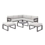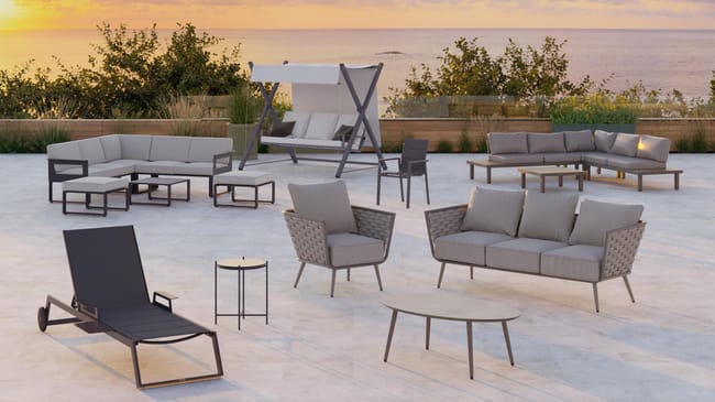 Zestaw ogrodowy Odyssea w eleganckiej szarej kolorystyce od Naterial to idealne rozwiązanie dla miłośników komfortu i stylu na tarasie czy w ogrodzie. Składa się z narożnika, dwóch stołków oraz stolika kawowego, zapewniając wygodne miejsce dla aż 7 osób.