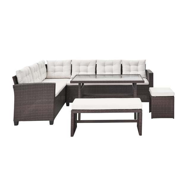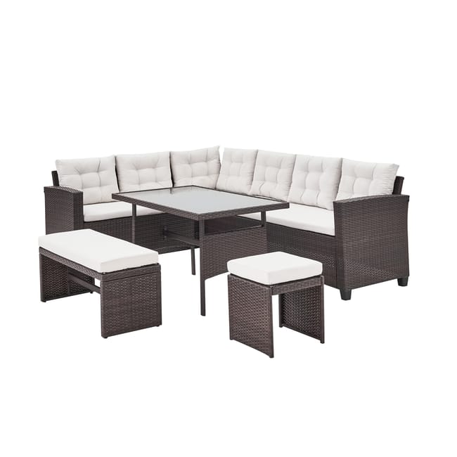 Zestaw ogrodowy Ontario to doskonałe rozwiązanie do maksymalnego wykorzystania przestrzeni na zewnątrz, łączące klasyczny design z funkcjonalnością. Narożny zestaw pomieści do 8–9 osób, dzięki czemu idealnie sprawdzi się podczas posiłków lub relaksu z rodziną i przyjaciółmi.