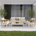 To połączenie nowoczesnego designu, funkcjonalności i wygody, idealne do ogrodu, na taras czy patio. Obszerna narożna sofa, dwa fotele oraz dwa stoliki kawowe tworzą wyjątkową przestrzeń do relaksu i spotkań towarzyskich na świeżym powietrzu.