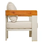 Poduszki wykonane są z wysokiej jakości tkaniny Olefin, odpornej na wilgoć i zabrudzenia, zapewniając komfort. Beżowy kolor poduszek doskonale współgra z siedziskami w odcieniach zieleni i szarości, nadając całości nowoczesny i stylowy wygląd. Sznurowe siedziska oraz ceramiczny blat stolika podkreślają elegancję i trwałość zestawu.