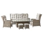 Zestaw mebli ogrodowych Verdi to doskonałe połączenie elegancji, funkcjonalności i trwałości. W jego skład wchodzą przestronna sofa, dwa fotele, dwa pufy oraz stół, co czyni go idealnym wyborem zarówno do relaksu, jak i spożywania posiłków na świeżym powietrzu.